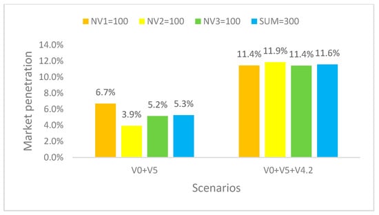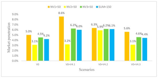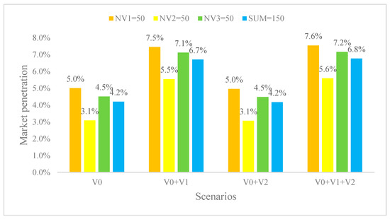 The market penetration under four scenarios V0, V0 + V1, V0 + V2, and V0 + V1 + V2.