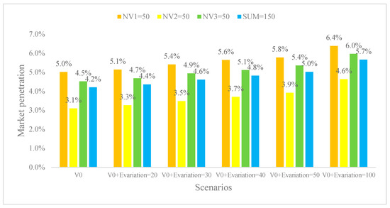 The larger the Evariation value, the greater the impact of the purchase decision of NEVs. We set five different values of Evariation to compare with the baseline scenario V0, as shown in Figure 5. The market penetration increases as the value of Evariation increases. The 10 increments of Evariation will bring a 0.2 percent point increment in the total market penetration. Considering NEVP < 100, the change is very small with the increments of Evariation.