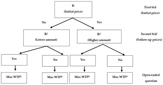 In practice, the double-bounded discrete choice format in CVM is more extensively used to elicit people’s WTP for environmental goods and services [47]. The National Oceanic and Atmospheric Administration (NOAA) suggests the double-bounded discrete choices format be recommended over other elicitation formats for estimating WTP. This format can better capture the thoughts of respondents’ than open-ended and bidding game formats. References [33,48,49] show that the use of a single or double bounded discrete choice is preferred for evaluating public goods, given the established incentive properties of these formats. Similarly, [50] support single and double bounded discrete choices as incentive compatible for public goods.
