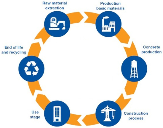 Life Cycle Assessment (LCA) is a tool that can be used to identify ways to decrease the environmental impact of a product or process and to inform decision makers of the consequences of changes to the product or process. LCA encompasses all aspects of a process or product from “cradle to grave”, including material extraction, transport, production, maintenance, and removal or recycling. The LCA of concrete consists of different stages including raw material extraction, cement production, and use stage, as shown in Figure 1 [28]. An LCA of concrete would demonstrate reduced CO2 emissions from cement production, as well as concrete’s service life and recyclability [29]. OPC is mainly composed of calcium silicate minerals. The raw materials are extracted and transported to the manufacturing facility to be crushed and ground before entering a large rotary kiln where materials reach temperatures of more than 1400 °C. Gypsum is added to the clinker to adjust the setting time.