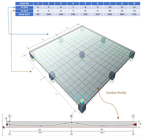 In this research, both conventional and PT-reinforced concrete flat slabs were designed based on the provisions of the ACI 318-18 using the same design parameters. In total, 68 PT and 9 conventional RC flat slab models for residential buildings with different geometry and span lengths were developed. Figure 2 illustrates the area and geometry of all investigated design cases. The slab models were initially designed in SAFE 2016, the academic version [30], and the outcomes were verified and confirmed by industrial partner specialists in PT floor design [31]. In each design case, the CO2 and cost were compared and comprehensively analyzed in relation to the main design parameters and variations in material composition and governing constraints of the derived designs.