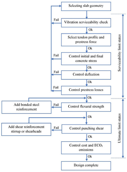 The final design of PT RC slabs should satisfy the criteria of safety and serviceability recommended by ACI 318-18 regarding the span-to-depth ratio, minimum slab reinforcement, punching shear strength, and heel drop vibration. These criteria were reflected as constraints in the design of each PT slab case. Figure 3 depicts the proposed design flowchart for the PT floor slabs in compliance with ACI 318-18.