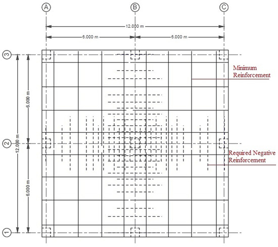 According to the pertinent ACI 318-18 design provisions, the span-to-depth ratio for PT flat slabs with a total imposed load of 5 kN/m2 is recommended to be 36. In negative moment areas at the column support, the constraint for the minimum area of bonded reinforcement at the top of the PT slab in each direction is expressed using Equation (3), where is the larger gross cross-sectional area of the slab-beam strip in the two orthogonal equivalent frames intersecting the column in a two-way slab system.