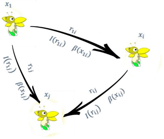 where is the maximum attractiveness at the Euclidean distance (the largest value of the firefly to attract another is naturally set to 1). To estimate the Euclidean distance between two fireflies, it is assumed that a firefly positioned at is brighter than another firefly situated at ; therefore, the firefly located at will move towards . Using this assumption, the Euclidean distance between any two fireflies and at and can be estimated as follows [53,55]: