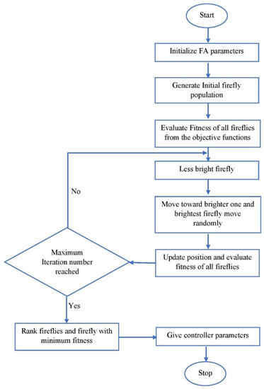 The Firefly algorithm introduced by Yang [47] in 2009 at Cambridge University is a swarm intelligence algorithm for optimization problems. Inspired by the behavior and flashing patterns of tropical fireflies, this algorithm is flexible and easy to implement. It is a metaheuristic bio-inspired algorithm with a random optimization, which converges to a comprehensive solution of an optimization problem. The Firefly algorithm employs the following idealized rules [51,52,53,54]: (i) No sex distinctions, i.e., fireflies pay attention to each other regardless of their gender; and (ii) the level of attractiveness of each firefly is proportional to its brightness. Considering two flashing fireflies, the less-bright fireflies will move towards the brighter one. This attitude implies the higher the brightness is, the smaller the distance between two flashing fireflies will be. In the case of no brighter firefly nearby, it will fly randomly, and (iii) the brightness of a particular firefly is determined using the objective function.