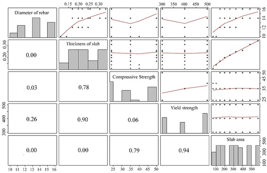 where Xn is the normalized value of the variable, Xmax is its maximum value, and Xmin is its minimum value. X is the original (non-transformed) value of the variable. The minimum and maximum values for each input variable have been given earlier in Table 3. Figure 8 shows the correlation matrix developed for the input variables in this study. Considering that the statistical behavior of the output parameters should be evaluated, boxplots were examined, indicating that they follow a normal distribution, as depicted in Figure 9 [58].