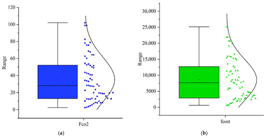 Probability plot diagrams for the overall (a) EMBODIED CO2 emission, and (b) cost.