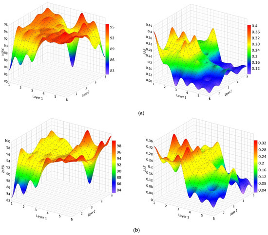 where NH is the number of hidden layer nodes, NI is the number of inputs, and is the number of training samples. Since the number of influential input variables is 5, the empirical equation showed that the number of neurons in the hidden layers should be either 10.5 or 11. Thus, several networks with different topologies with a maximum of two hidden layers and 10 neurons were trained and studied in this study. The hyperbolic tangent stimulation function and the Levenberg–Marquardt training algorithm were used in all networks. The statistical metrics used to evaluate the performance of different topologies were the average absolute error (AAE), the coefficient of determination (), and the variance account factor (VAF), which are defined in Equations (15)–(17) [60]. In total, 25 topologies were examined, and it was found that the network with the topology consisting of the 5-4-5-2-layer architecture achieved the smallest error values for AAE, VAF, and the highest value of R2 in estimating the output parameters. To represent the accuracy of all the examined topologies, the R and RMSE indices were investigated, as depicted in Figure 10.