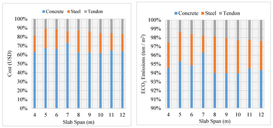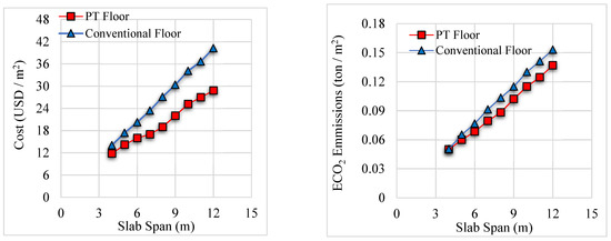 Figure 12 depicts the cost and embodied CO2 emissions of PT and conventional RC slabs for different span lengths. The results indicate that by increasing the slab span, both the cost and embodied CO2 emissions were decreased. According to Figure 12, the cost and embodied CO2 emissions decreased by 39% and 12%, respectively, in the PT slab with a 12 m span length compared to a conventional slab, yet these percentages were relatively smaller (18% and 1%, respectively) for a PT slab with a 4 m span length. Such a finding complies with previous findings in [63] where the cost analysis confirmed that the post-tensioned flat-slab system provides a better cost reduction of approximately 16.5. However, the current study did not consider the labor cost and technical equipment requirements, and therefore PT floor slabs may not be economically justifiable for span lengths shorter than 6 m.