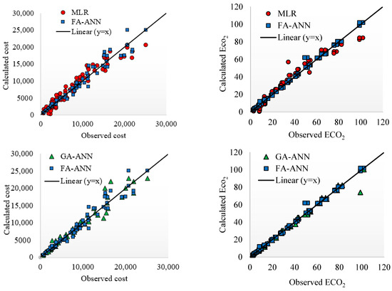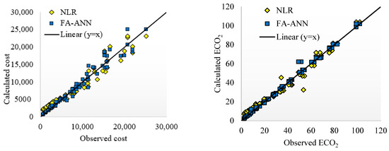 where y is a dependent variable; x1, x2, … are independent variables; and a1, a2, … are equation coefficients. In this study, different models of MLR were examined for input and output variables. The most suitable coefficients using the MLR model for the output parameters, overall cost, and embodied CO2 emissions, are presented in the following equations.