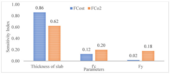 where is the rebar diameter, is the thickness of the slab, is , is , and is the slab area. The nonlinear regression model (NLR) involves a comprehensive range of techniques for analyzing variables, particularly once the limited number of data has been determined. Nevertheless, this technique has some drawbacks, including not covering variables in all their possible range and using iterative methods to find the proper relationship. NLR has been successfully applied in diverse simulations and analyses in the domain of civil engineering, including modeling the compressive strength of recycled aggregate concrete, structural health monitoring, and predicting the ductility of reinforced concrete beams [62]. The most suitable coefficients using the NLR model for the output parameters, overall cost, and embodied CO2 emissions, are presented in the following equations.