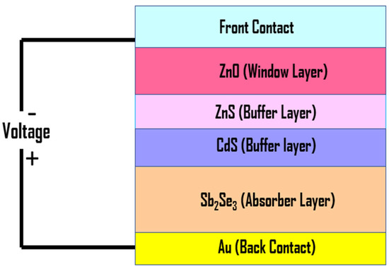 The present work is a simulation of a ZnO/ZnS CdS/Sb2Se3/Au solar device under AM 1.5 G and 100 mW/cm2 illumination, where ZnO is used as a window layer, ZnS/CdS as the buffer layers, Sb2Se3 as an absorber layer, and Au as a back contact metal, as shown in Figure 1.