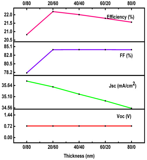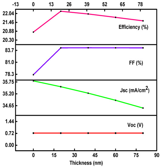 Zinc sulfide (ZnS), which is nontoxic and has a large bandgap, is a promising material as a buffer layer in solar cell devices. By changing the thickness of the ZnS layer, all of the parameters (Voc, Jsc, FF, and η) are also changed, as shown in Figure 4. The thickness was varied up to 80 nm, and the Voc was almost the same for all thicknesses. The Jsc first increased up to a 20 nm thickness, and then the change was tiny because the bandgap of ZnS was higher and the carrier concentration was very low. When the thickness of the ZnS buffer layer was set to be zero, the fill factor and the efficiency of the device was 84.27% and 21.56%, respectively, and later, when the thickness increased to 20 nm, the fill factor (78.07%) and the efficiency (20.83%) decreased. For 20 nm and higher thicknesses, both the fill factor and the efficiency changed only by a small amount, with change in the thickness of the ZnS buffer layer, as the increased thickness of ZnS has only a minor impact on the depletion region.