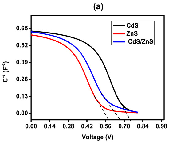(a) Mott-Schottky; (b) capacitance-voltage curves for three different buffer layers: CdS, ZnS, and CdS/ZnS.