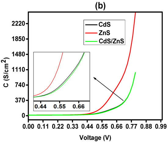 The CV characteristic [19] helps a solar device to reveal the more fundamental properties. The CV plots for three different buffer layers (CdS, ZnS, and CdS/ZnS) are studied here. The relation between the capacitance and the depletion region, NA, is given by Equation (8):