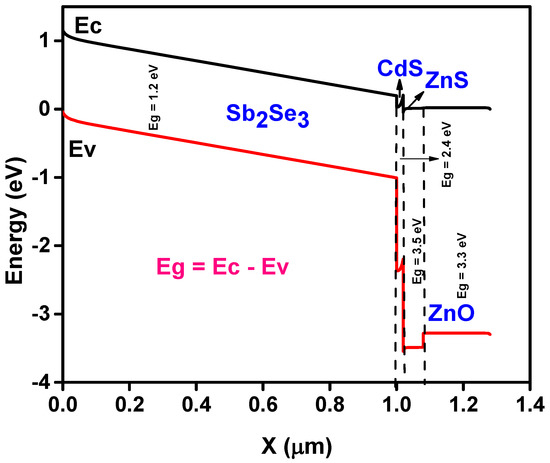The energy band diagram for ZnO/CdS and ZnS/Sb2Se3/Au is shown in Figure 7. The plot is for Sb2Se3 as an absorber layer, with a thickness of 1 µm; CdS and ZnS as the buffer layers, with thicknesses of 20 nm and 60 nm, respectively; and ZnO, with a thickness of 200 nm, as a window layer. The n-type and p-type regions, and their related valence bands and conduction band edges, and the bandgap values are shown in Figure 7. When photogenerated carriers get separated at the interface between the absorber and buffer layers, the strong electric field accelerates them, causing them to be dragged away from the junction fast. The electrons move into the buffer layer, and the holes move through the absorber layer and are collected by the back contact. The band offsets are well-suited for the charge carriers, which reach the metal contact, avoiding recombination.