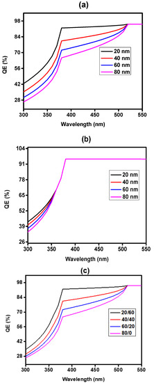The thickness of the buffer layers (CdS, ZnS, and CdS/ZnS) affects the photon absorption and the quantum efficiency (QE), as shown in Figure 8a–c. By increasing the thickness of the CdS buffer layer, the intensity of the shortwave band decreases. This means that the thin buffer layer showed a significant band response.