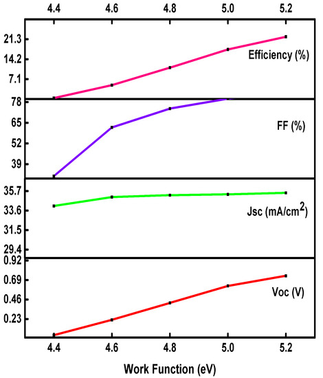 Effect of different back contact metal work functions on various parameters (Voc, Jsc, FF, and η).
