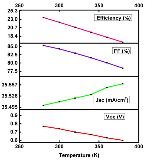 Temperature plays a vital role in the performance of a solar cell, as the efficiency and power depend on the operating temperature. The parameters, FF, Voc, and η, decrease with increasing temperature. The parameters are presented in Table 3.