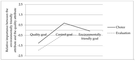 Finally, we analyzed the relative importance between the environmentally friendly attribute and the quality attribute. As expected, participants indicated that the environmentally friendly attribute was more important than the quality attribute in the choice mode (−0.217) than in the evaluation mode (−0.974, F(1,151) = 3.769, p = 0.054). Among the three goals, we found a significant difference in relative attribute importance in the control goal condition (0.156) and in the quality goal condition (−1.607, p = 0.054). However, we did not find a statistical difference in relative attribute importance between the control goal condition and the environmentally friendly goal condition (−0.335, p = 0.287). Notice that attribute weight is inconsistent with our findings about choice and evaluation, suggesting that consumers do not necessarily follow their attribute weight to make a choice or evaluate options (see Figure 2).