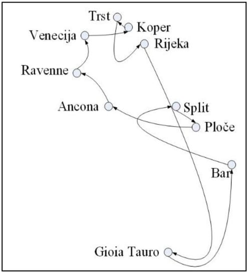 An analysis of the presented feeder services shows that the above routes involve the following Adriatic seaports: Bar, Ploče, Split, Rijeka, Koper, Trieste, Venice, Ravenna and Ancona. These ports will be included in the model. Figure 1 features the model for the feeder service in the Adriatic Sea.