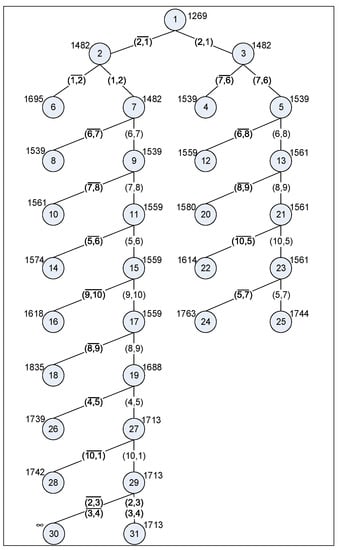 The branch and bound method divides the set of all rotation travels into two disjoint subsets (branching). The lower cost limit (bound) for a given length of travel is calculated for each of the subsets [54]. The first step is to set the requirement cii = ∞ in order to prevent the travelling salesman from selecting the shortest route as 1→1, 2→2, 3→3, 4→4, 5→5, 6→6, 7→7, 8→8, 9→9 or 10→10. The next step is to resume branching by dividing the subset with the lower bound into two parts. The procedure is repeated until a subset is obtained with only one rotation travel whose bound is smaller than or equal to the bounds in other subsets. In this procedure, the subsets are described as nodes, and the partition process is presented as branching of a tree—hence the name. Figure 3 presents a completed tree obtained through the branch and bound method.