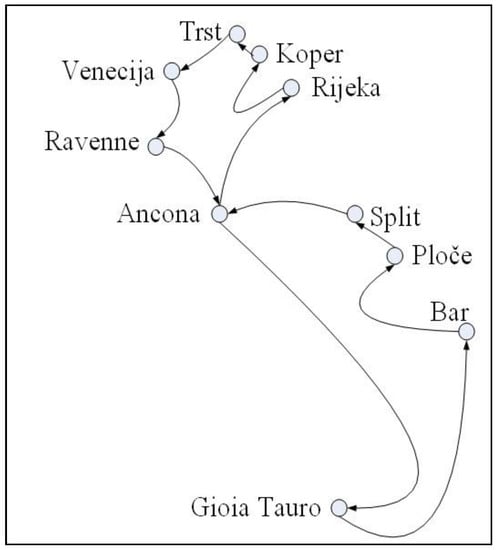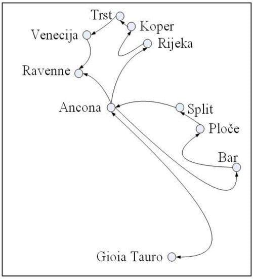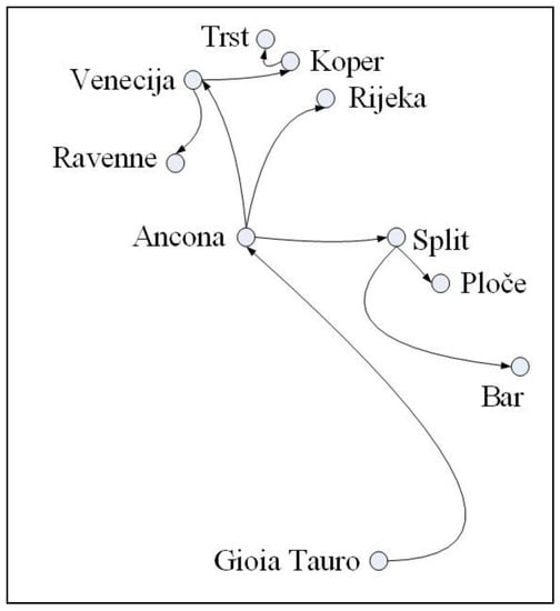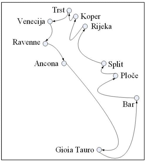 Such traffic option proposes that cycles are not being made, but, in MST, there is a different d (d = 1, 2, 3…). For example, if d = 1, it means that such port is not appropriate for making cycles toward other ports. It significantly increases travelling distance because it is necessary to return back from such edge port to the starting port, e.g., Ancona—Rijeka (see Figure 5), and to start another route to call all other ports. This solution could be very far from minimal distance route.