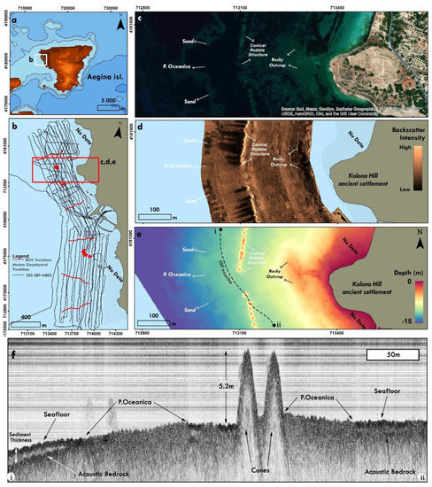 - Georgiou, N.; Dimas, X.; Fakiris, E.; Christodoulou, D.; Geraga, M.; Koutsoumpa, D.; Baika, K.; Kalamara, P.; Ferentinos, G.; Papatheodorou, G. A multidisciplinary approach for the mapping, automatic detection and morphometric analysis of ancient submerged coastal installations: The case study of the ancient Aegina Harbour Complex. Remote Sens. 2021, 13, 4462. [Google Scholar] [CrossRef]