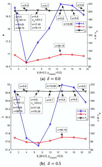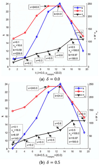 Table 2 provides a sample set of results in our numerical experiments for the model with only nonprofessional hosts on the supply side. The results show that, except the profit the platform firm receives, all values, the total market transaction value , the average earning per listing the nonprofessional hosts obtain , and the realized number of participating hosts become larger when is of value 20. Based on the results, and move in the same direction because Equation (15) can be rewritten as . During all the demand periods, we found that when the host’s price is lower, the platform firm can charge higher transaction fees and thus sometimes have higher profits.