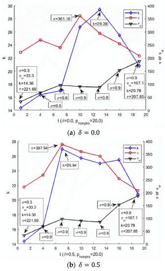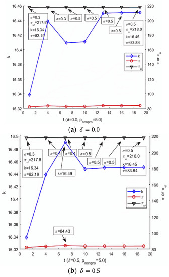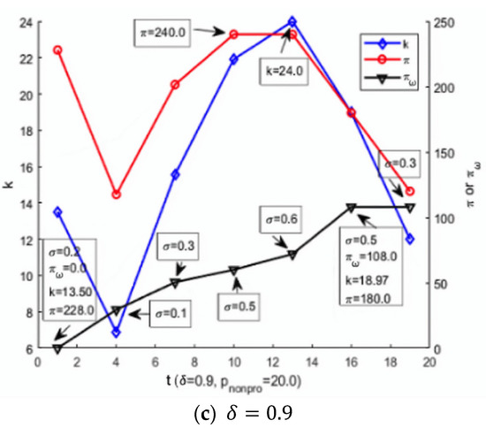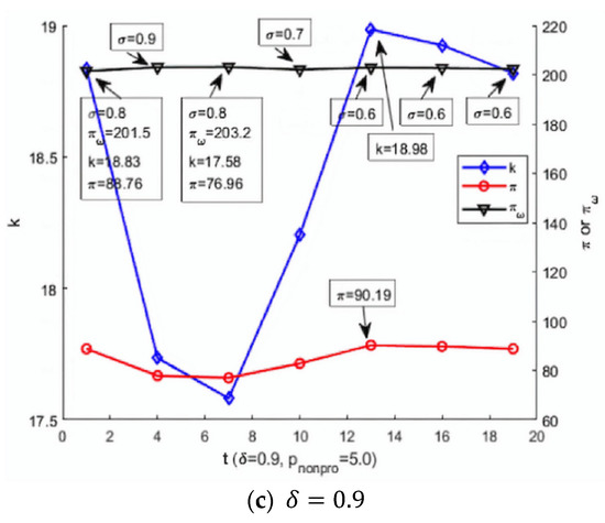 We assume the ratio is valued in {0.1, 0.3, 0.5, 0.7, 0.9} across numerical experiments, but everything else is equal to the models in the earlier subsections. In the customer-choice models of (3) and (4), is induced to represent the difference of customers’ preference for the two groups of hosts in location, cooking facilities, and so on, and valued in {1, 4, 7, 10, 13, 16, 19}. A larger leads to more difference between the preferences the customers perceive from professional and nonprofessional rental services. We generate the simulation data by setting the price levels of nonprofessional hosts to be and in turn. In the numerical experiment for the extended model, the professional host’s pricing is restricted to be within . If it leaves this range, all consumers purely choose either type of hosts, therefore, it is not necessary to allow . We depict the changes in the cumulative value of all transactions as , the number of participating hosts in the market as (as, most often, move in the same direction with , hence, we delete it from the figures below), and profit with the value of increasing in Figure 1, Figure 2, Figure 3 and Figure 4. The data points of the curves indicate the optimal-value information for and its corresponding value of . From Figure 1, Figure 2, Figure 3 and Figure 4, we draw two conclusions. Conclusion 2: (1) The cumulative transaction value of the market and supply size do not always move in the same direction (please refer to Figure 4), and (2) the optimal value for the platform’s profit cannot lead to optimal values for and . Conclusion 3: (1) When customers have a preference difference between service from the two types of hosts (), a high ratio of professional hosts cannot guarantee maximum values for , (which indicated long-term success of the market), and ; and (2) a high value of usually leads to the maximum value of the platform’s profit . A possible explanation for the second part of Conclusion 3 could be that when becomes larger, customers’ choice of service from professional hosts is insensitive to , so the platform has more flexibility to adjust to a larger profit value of .