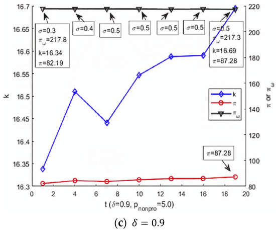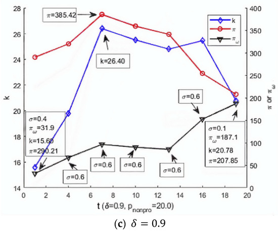 With increasing t, the change curves of the cumulative market transaction value (red curve with dots), platform profit (black with inverted triangles), and number of participating hosts in the market (blue with diamonds) under during the high-demand; (a) ; (b) ; (c) ; period ().