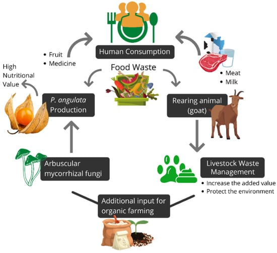 The developing organic farming system using goat manure and AMF in P. angulata production can be considered as an alternative way to handle environmental pollution caused by excessive livestock wastes. This can be considered as an implementation of circular bioeconomy in farming activities, especially in a case study of Indonesia. Rearing animals and doing farming will be more beneficial under this circular paradigm to increase farmer’s income and preserve the environment (Figure 1).