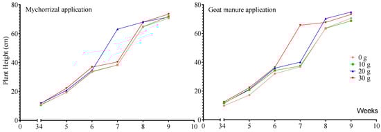 P. angulata treated with mycorrhizal and goat manure grew significantly week by week (Figure 2). However, there was no interaction between the two factors. Statistically, the application of mycorrhiza and goat manure also revealed no effect on plant height of P. angulata. Kapoulas et al. [14] stated that AMF inoculation should have great potential in enhancing the growth and yield even in high soil P, but Zhang et al. [15] said that AM colonization and plant growth significantly increased at low organic fertilizer rate and decreased or had no significant differences at the highest fertilizer rate compared to the uninoculated plants. The complexity and interaction of plant genotypes and AMF, the method and time of inoculation, the production system, and environmental conditions may show different results [14].