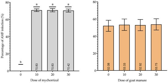 The level of AMF infection was high around 50–70%. It has correlation to soil physical and chemical properties because the soil provides growth environment to the spores, including water content, temperature, soil texture, pH, organic carbon, available P, exchangeable K, and nitrogen [32]. Moreover, the addition of goat manure and zeolite as a carrier of AMF also pointed effect of AMF infection through the changes in soil conditions. Zeolite amendment can improve water productivity, prevent soil nutrient losses, and change the soil texture in the long term [33,34].