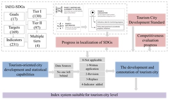 Construction of sustainable development index system for tourism cities. Note: SDG localization steps refer to Sustainable Development Goals of the City of Los Angeles: A Local Review of Progress in 2019 [23]; SDG localization progress mainly refers to relevant achievements at the global, regional, national, and sub-national level [24,25,26,27,28,29,30,31,32,33,34,35].