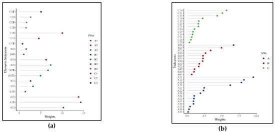 The weights of systems A, B, and C are 40, 33.35, and 26.52% respectively, indicating that natural and cultural resources and protection systems are the main drivers for evaluating the sustainability of tourism cities. The largest weights of pillars are natural and cultural resource endowment (A1), degree of tourism infrastructure construction (B2), and economic support of natural and cultural resources (C1). The weight distribution of factor indicators, and specific indicators is shown in Figure 2a,b.