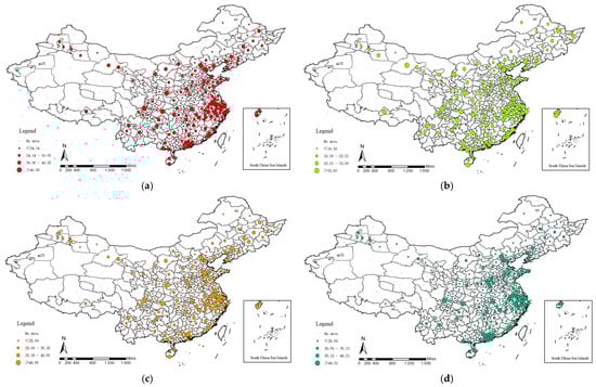 Geographic distribution of sustainable development scores of tourism cities: (a) overall score; (b–d) B, C, and D system scores.