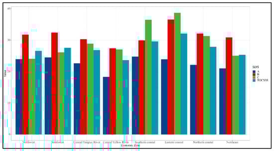 According to the report “Strategies and Policies for Coordinated Regional Development” issued by the Development Research Center of the State Council of the People’s Republic of China, the mainland is divided into four plates and eight comprehensive economic zones. In order to facilitate a comparative analysis of cities in their economic zones, we obtained the regional distribution of 221 tourism cities with reference to the eight comprehensive economic zones. The average score of sustainable development of tourism cities in the eight economic zones is shown in Figure 4 As can be seen from Figure 4, the overall average score of sustainable development in the eastern coastal economic zone is the highest, while that of the middle reaches of the Yellow River is the lowest. Economic zones with the highest average scores for sustainable development in pillars A1, A2, A3, B1, B2, B3, B4, C1, C2, and C3 are the southern coastal areas, the middle reaches of the Yangtze and Yellow Rivers, the southern and eastern coastal areas, and the eastern coastal economic zone. The lowest economic zones are northwest, northern coastal, northeast, middle reaches of the Yellow River, northeast, northwest, eastern coastal, northwest, southwest, and northern coastal economic zones.