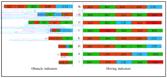 To explore indicators affecting sustainable development, this paper defines the drivers as the five indicators with the highest sustainable development scores in the eight districts based on three-axis, eight-quadrant zoning, and the obstacles as the five indicators with the lowest scores, as shown in Figure 5. As can be seen from the figure, the main driving factors of and obstacles to sustainable development of tourism cities are different. Specifically, the main driving factors in the eight districts are proportion of safe treatment of wastewater (A34), rate of harmless treatment of municipal solid waste (A35), and greenhouse gas emission intensity (A36) in system A and water resources development and utilization rate (B41) and intensity of tourist space utilization (B42) in system B. Mortality due to road traffic injuries (C20) in system C is also one of the main driving factors. There are great differences among the obstacles to sustainable development: In districts I, II, III, IV, and VIII, system A is the main obstacle to increasing the level of sustainable development. In areas V and VII, systems C and B are the main obstacles, and in area VI, system B is the main hindrance.