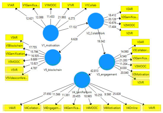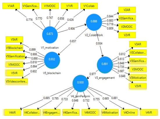The research objective was to identify the relevance and influence of student motivation, collaborative work, engagement, and blockchain on student learning performance. Figure 4 shows the structural model of analysis. The first variable, V1, is named “Student Motivation”. Through Cronbach’s Alpha, we verify if items such as student collaborative work, MOOCs, AR, VR, and gamification influence V1. The second variable, V2, is named “Student Collaborative Work”. Through Cronbach’s Alpha, we test if V2 is influenced by MOOCs, AR, VR, and gamification. The third variable, V3, is named “Student Engagement”. Through Cronbach’s Alpha, we test if V3 is influenced by student collaborative work, MOOCs, student motivation, AR, VR, and gamification. The fourth variable, V4, is named “Learning Performance”. Through Cronbach’s Alpha, we test if V4 is influenced by student collaborative work, student motivation, student engagement, MOOCs, AR, VR, and gamification and online classes. Table 1 presents the variables and respective indicators. The fifth variable, V5, is named “Blockchain”. Blockchain is used in HE for a massive audience, and through Cronbach’s Alpha, we test if V5 is influenced by MOOCs, AR, VR, gamification, blockchain facilities, and videoconferences.