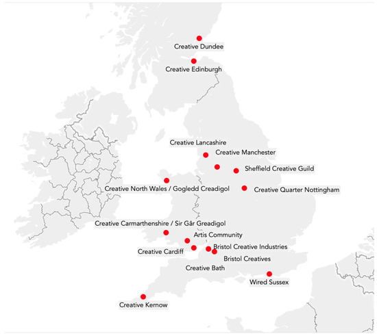 These criteria incorporate a variety of network organisations we identified that operate in the UK and that represent a recognizable cohort of like-minded organisations, which have received, in recent years, increasing attention through policy makers. Our focus is on place-based initiatives with the aim to bring people together in real time in real places to make their local creative industries more sustainable. Below, we give more details about their specific characteristics and commonalities. We do exclude broader sectoral networks, associations (e.g., the Royal Institute of British Architects) or agencies with national remits (e.g., Creative England, Creative Scotland, Creative Wales or UK Arts Councils) to be able to focus on this new phenomenon of creative networks that have been established in recent years.
