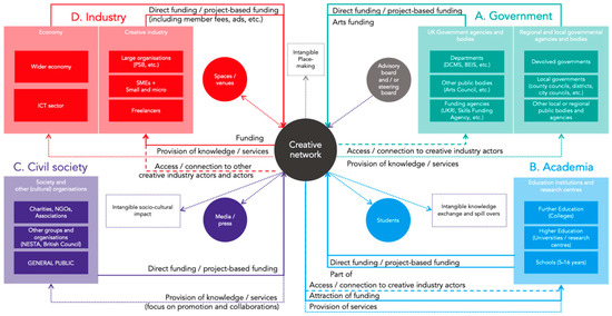 Devolved and local governments in the UK are essential actors in the value network of creative networks. These bodies fund activities of creative networks (direct/project-based funding). In exchange, these networks provide governments with knowledge and services, as well as access to other actors in the network. A good example of this is the agreement between Creative Manchester and the Manchester City Council, through which students at Manchester University can work every year on placement at the Manchester International Festival (https://www.youtube.com/watch?v=2-5bgKcCKo0, accessed on 20 September 2021). Such initiatives show how creative networks create both economic and cultural value while enforcing sustainability in the local economy. Policy makers often use creative networks as representatives for the local creative industries, insofar as they generate knowledge exchange and feedback loops between the government and creative industry players.