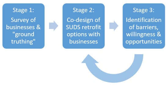 Stage 3: Identification of barriers, willingness & opportunities. As barriers (e.g., factors such as logistical constraints, cost, and land take) were identified, the SUDS retrofit options were redesigned with these factors in mind as part of the iterative co-design process.