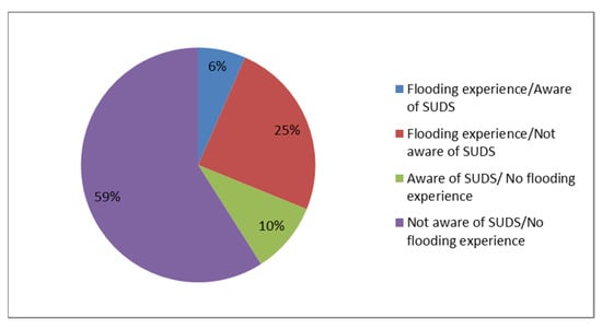 Pie chart illustrating the relationships between the experience of flooding and the claimed familiarity with SUDS (n = 61).