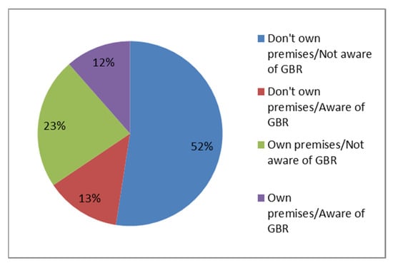 Only a minority of companies (<25%) claimed awareness of the general binding rules (GBR) regulating pollution prevention at the industrial sites in Scotland. Interestingly, among the companies who owned their premises, only a minority were aware of the GBR rules (12% of total premises surveyed), while almost twice as many had never heard of them (Figure 4).