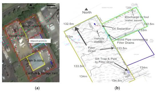 Case study A: (a) layout of the premises, (b) topography and existing SUDS features. Elevation contours enhanced for clarity.