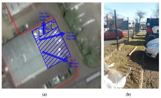 This simple test shows that it would be useful to create a swale on the green space. The delivery yard has a kerb along its length that would have to be removed or modified in such a way to provide entry points for the water. Figure 7 shows the strip of green space which could be modified into a swale. It would also be prudent to create a filter strip (total length of 36 m) along the east and south side of the delivery yard to contain contaminants before water enters the sewer network. The costs of the filter strip would be around GBP 2–GBP 4/m2 according to 2007 values [27].