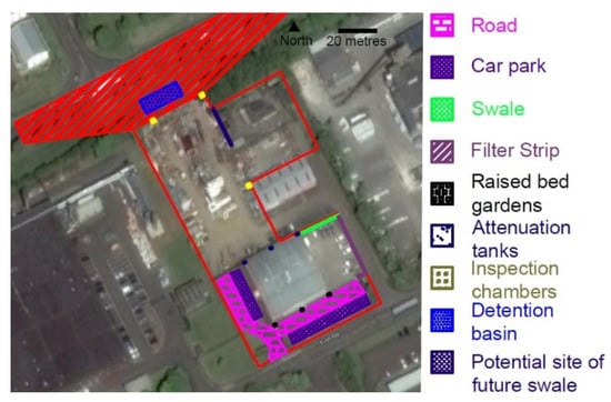 - Krivtsov, V.; Arthur, S.; Semple, C.; Sevilla, A.E.; D’Arcy, B.J. Retrofitting SUDS at Industrial Premises. In Proceedings of the 2nd International Conference on Natural Hazards & Infrastructure (ICONHIC), Chania, Greece, 23–26 June 2019; Available online: http://www.urbanfloodresilience.ac.uk/documents/krivtsov-et-al.-iconhic-2019.pdf (accessed on 24 September 2021).