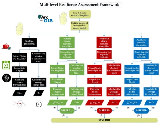 To the best of our knowledge, no published work has suggested a framework to evaluate the resilience of road networks during MSEs to date; thus, the main objective of this research is to suggest a framework for assessing the resilience of road networks during MSEs, paving the way for considering resilience as a criterion in evaluating future host cities’ nomination profiles. The additional contribution of the suggested framework is addressing the network’s resilience on multiple levels, rather than the common approach of focusing on a single, certain level. Furthermore, the flexibility of the suggested framework to produce a combined and weighted index under different threats of interest allows for the comparability of different development plans and the evaluation of their effectiveness under the credibility of possible threats. The suggested framework focuses on urban areas and assumes that the event’s activities would be compacted to be contained in a metropolitan area. However, in the case of multiple host cities, the framework concepts could be adopted and modified to accommodate related complications, but that is out of the scope of this paper.