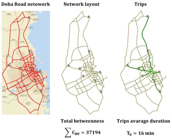 Doha Road network (the baseline case). In the baseline case, the sum of betweenness centrality of all nodes is ∑CB0 = 37,194, and the Average important trips duration is T0 ≈ 16 min.